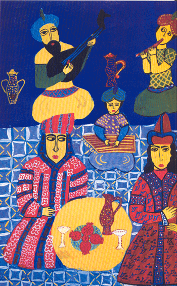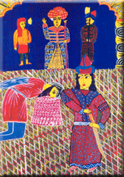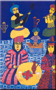 | the sound of song and music coming from a poor man's house. He paused a moment, then curious, he boidly entered and saw that it was an empty, desolate home. On a carpet spread before the fireplace, huddled around a plain table, the owner of the house and musicians were playing, singing and having a great time. |