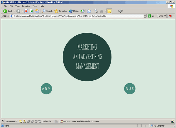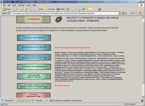 Development of distance learning courses in Armenian "Marketing and Advertising Management" and "E-commerce." These courses will be accessible to all those interested, regardless of their field of specialization. There is a lack of teaching materials in the field of marketing, advertising, and e-commerce and this would provide materials to a large number of individuals, http://iatp.irex.am/learning and http://iatp.irex.am/e-business/ .