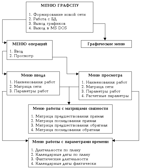 После ввода кода сети система производит анализ на существование сети со введенным кодом. В случае отсутствия сети с заданным кодом система выдает сообщение об отсутствии сети. При существовании сети с указанным кодом система производит считывания данных с базы (винчестера или гибкого магнитного диска), расчитывает параметры сети. При этом на экране дисплея появляются предупреждающие (мерцающие) сообщения "ИДЕТ ЧТЕНИЕ" и "ИДУТ РАСЧЕТЫ". По завершении расчетов на экране появляется меню ГРАФСПУ. Работа с меню довольно проста и удобна. Для получения дополнительной информации для работы с меню можно вызвать структурную схему меню, введя символ "?".
