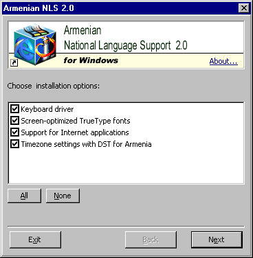 Armenian NLS is shipped as a single self-installing executable named "nls20.exe". To avoid viruses and trojan horses, it is strongly recommended to download the installer from the Armenian NLS master web site - http://www.freenet.am/armnls - or, otherwise, from a mirror site introduced on this page.