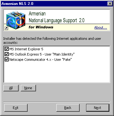 The next screen will show you the list of Internet applications found on your system by the installer. Some programs have separate profiles for different users, e.g. if you have different profiles created by the Netscape Communicator's User Profile Manager, the installer will list them as separate options. Choose the applications and the user accounts (profiles) you wish to add Armenian NLS to and click "Next".