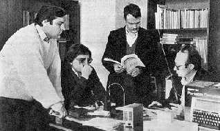 НА СНИМКЕ: руководитель Центра "Поиск" Артур Пахлеванян, радиолюбители зи Еревана Сергей Тимонин, Анатолий Верещагин и Вениамин Левчин заняты изучением и апробацией новой аппаратуры из США.