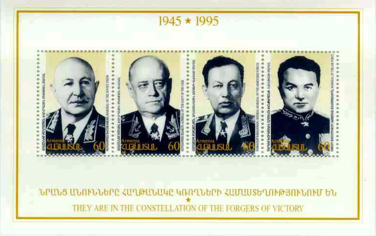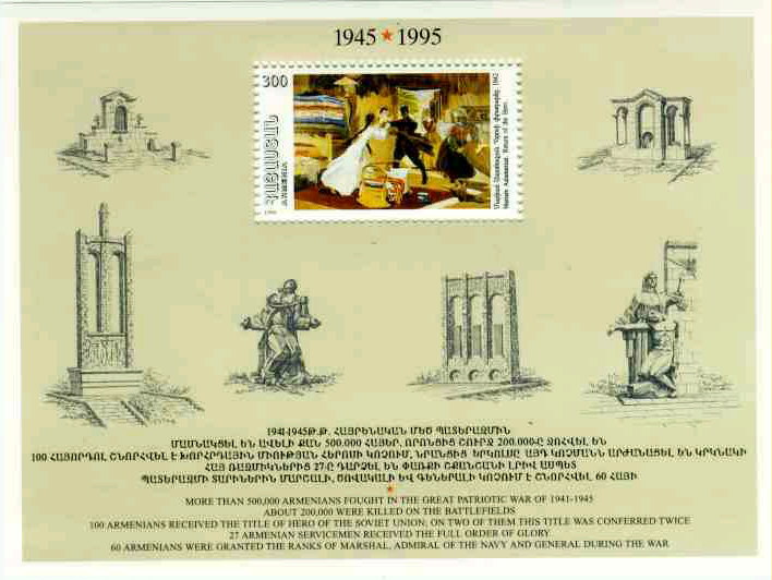 On May 9, 1995 Armenia, along with many other countries of the world, celebrated the 50th anniversary of the termination of the Great Patriotic War. More than 500.000 Armenians have fought in that war, 200.000 of which never returned home. One hundred Armenian servicemen have become Heroes of the Soviet Union, two of these have received the honour twice. Twenty seven Armenians have been endowed with the full Order of Glory. Sixty Armenians have received the ranks of a general, admiral or marshal during the war.