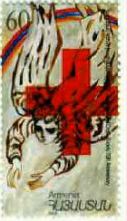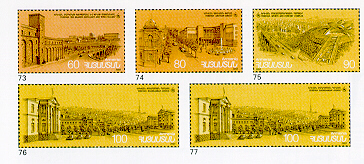 This emmission is a tribute to the capital of Armenia-Yerevan, the site of the "Armenia-01" International Philatelic Exhibition in 2001. The cuneiformmessage of king Argishti attests that Yerevan (Erebouni) was founded in 783 BC. Many people maintain that Yerevan is one of the most beautiful cities in the CIS context. It has a fascinating character, boasts unigue architectural solutions and pursues modern urbanization trends.