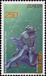 The stamp represents a Christmas scene. The peculiarities of Armenian and Russian Christian miniature - painting of the Middle Ages are synthesised on the picture.