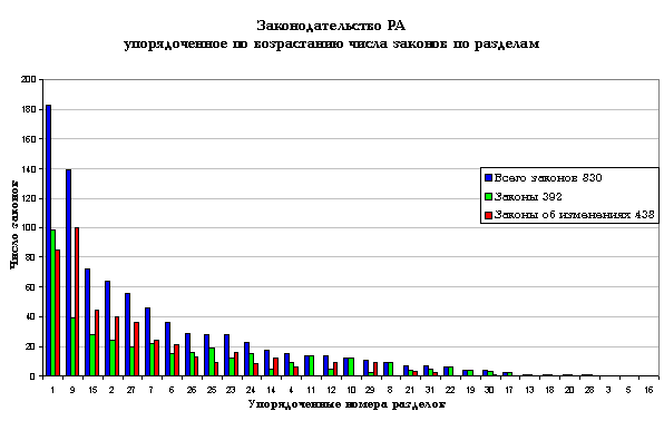 Общее количество принятых законов по нижней десятке разделов равно 14, из них основных законов - 13 и один закон об изменениях и дополнениях! Диспропорция (дисбаланс) в приоритетах первой пятерки (и двойки) и последних разделов (десятки и пятерки), замыкающих упорядоченный список всех 31 разделов законодательства, не может быть научно аргументирована. Сложившаяся картина свидетельствует о недостаточном уровне планирования и проектирования в области законотворчества, о слабости демократии в законопроектирующей сфере, об отсутствии механизма реального контроля со стороны гражданского общества за осуществлением законодательной властью своих непосредственных функций в соответствии с требованиями Конституции. Эта картина отражает наличие открытой и скрытой правовой несовершенности в развитии демократизации страны, о нарастающем противоречии в отношениях власти и общества, в отношениях бедных слоев населения к богатой прослойке общества, в экономических отношениях.