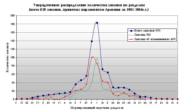 Анализ международного опыта, в том числе моделей законотворчества различных стран мира позволил выявить определенную строгую закономерность в распределении соответствующих разделов законодательства, в приоритетах, числа и последовательности принятых законов. Чем более развита демократия и свободны экономические отношения в стране, тем ближе нормированная кривая распределения числа принятых законов по упорядоченным разделам законодательства (в соответствии с принятым классификатором свода законов) приближается по форме к кривой нормального распределения, характеризующая развитые страны демократии с развитой правовой системой.