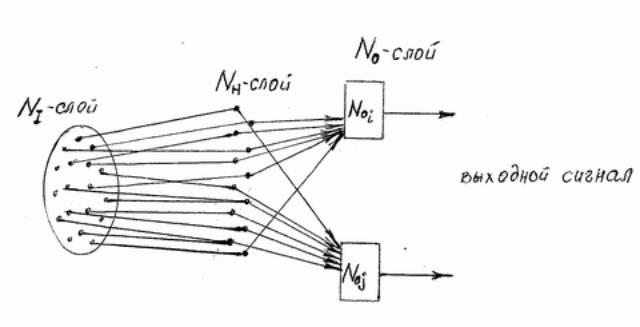 В звисимости от характера внешнего раздражения в NI – слое образуется некая совокупность импульсов (сигнлов), которые расспространяясь по нервным путям, достигают нейронов NH – слоя , где в соответствии с совокупностью пришедших импульсов образуются новые импульсы, поступающие на входы нейронов No – слоя. В нейронах NH – слоя суммируются входные сигналы с одним и тем же коэффициентом усиления (возможно с разными знаками), в нейронах же No – слоя суммируются сигналы с различными как по величине, так и по знаку коэффициента.