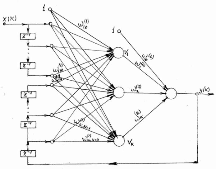 Это динамическая сеть, характеризующяся запаздывнием входных и выходных сигналов, объединяемых во входной вектор сети. Рассуждения косаютя узла x(k) и одного выходного нейрона, также одного скрытого слоя. Такая система реализует отобржение: