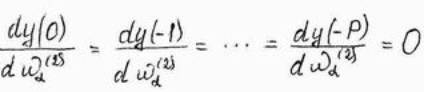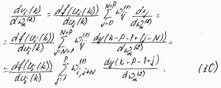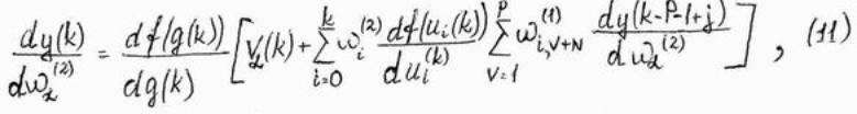Рекуррентная формула (11) позволяет рассчитать значение производной dy(k)/dwa(2) в произвольный момент времени по её значениям в предидущие моменты. Она связывает значения производных в момент t со значениями тех же функций в моменты t-1, t-2, …, t-P. Можно предположить, что начльные значения производных от сигналов перед началом обучения равны, т.е.