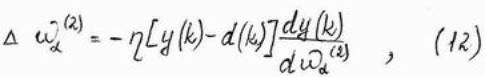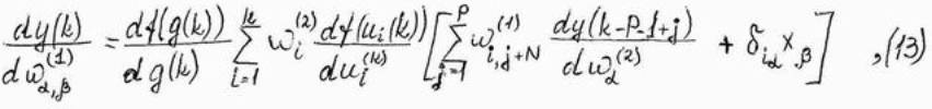 3. С помощью зависимостей (11) и (13) определить значение производных dy(k)/dwa(2) и dy(k)/dwab(1) для всех значений a и b,соответствующих весам сети из изначально выбранной структурой.