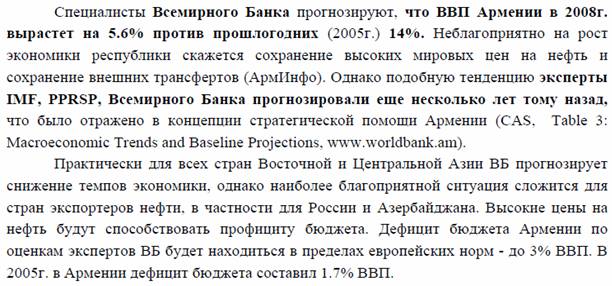 3. Прогнозы экспертов Всемирного банка и автора совпали, но если первые прогнозировали замедление темпов роста экономики Армении в основном из-за сохранения высоких мировых цен на нефть и сохранении внешних трансфертов, то автор учитывал тенденции падения показателей экономики Армении, основанной на знании. В 2008г. цены на нефть падали, а внешние трансферты в 2008г. хотя и росли по сравнению с 2007г., но этот рост нивелировался снижением курса доллара по сравнению с предыдущим годом. Однако в целом рост ВВП Армении в 2008г. замедлился.