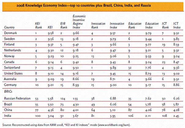 Ранги ведущих стран мира по показателям Индекса экономики знаний (2008г.)