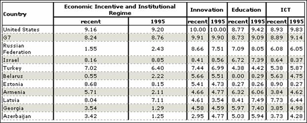 В мировом рейтинге Индекса экономики знаний по данным Всемирного банка (базы КАМ на 2008г.) Российская Федерация занимает 53-е место, Турция – 52-е место, а Армения – 61-е место. Более подробные данные в сопоставлении показателей Армении, России и Турции представлены ниже. В диаграмме 5 приведены соответствующие позиции Армении в мировом рейтинге на 1995-2008гг.