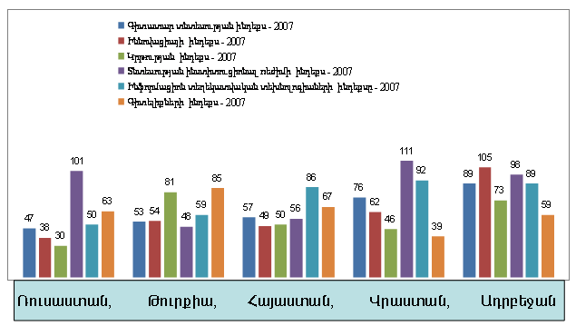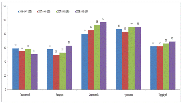 Диаграмма 4 демонстрирует снижение позиции Армении в мировом рейтинге конкурентоспособности в сопоставлении с соседними странами на 2006-2009гг. по данным Всемирного экономического форума. Оно отражает последствие негативных тенденций в развитии прежде всего экономики знаний. Если Армения в 2006-2007гг. занимает 80-е место в мире по показателю конкурентоспособности, то в 2008-2009гг. - 97-е место, отставая от России (51-е место), Турции (63-е место), Азербайджана (69-е место) и Грузии (90-е место).