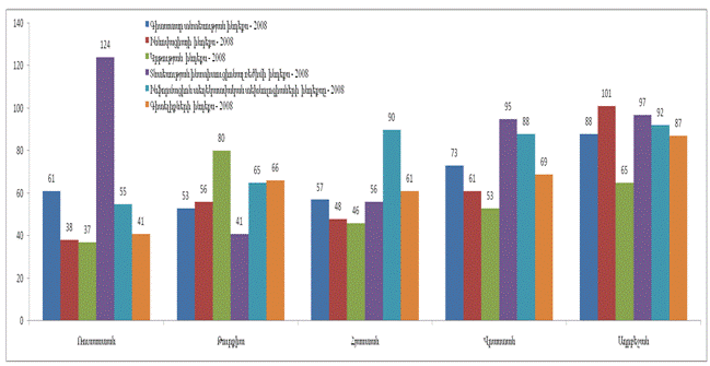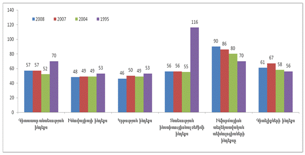 Из диаграммы 5 видно, что позиция Армении по индексу экономики знаний в мировом рейтинге на 1995 – 2008гг. выросла на 13 пунктов, в то же время ее позиция по индексу Информационно-коммуникационные технологии снизились на 20 пунктов, а по индексу знаний соответственно на 5 пунктов.