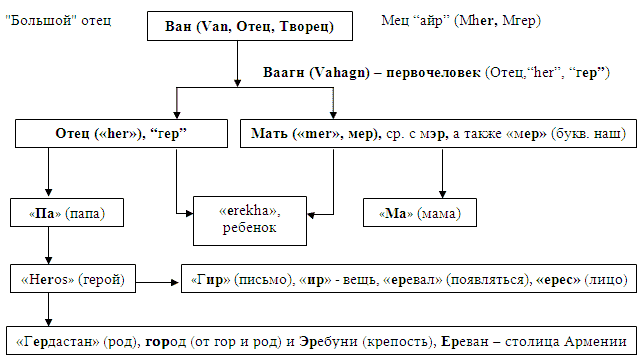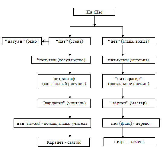 На рис.1 представлена структура образования ключевых понятий Па - Отец (творец) – сын - первочеловексемья. Отец на арм. па – hair (айр), her, ма - мать (mair), mer и дитя (erekha). На рис. 2 представлена схема трансформации архетипа слова Отец (основа, стена, гора, скала, ср. "апер" букв. брат) по алгоритму "па-пат-пет - пер" в слова (имена) Петр, Петер, Перун, Перкунас, Перва, Парьянья, П(Ф)ьерегунд, Перуа (фараон).  Ваагн -  первочеловек ("one"), громовержец, основа, защитник, спаситель, герой, стена, родоначальник, вождь, главный герой (heros), Отец рода человеческого,  творец. Ваагн по существу трансформируется в архетип образа "камня, стены (букв. "пат"), а его потомок Айк от Ноя – Наапета -Апетнака (Иафета) становится основателем государства букв. "петутюн").