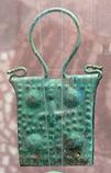 По обеим сторонам от мужской фигуры находятся изображения птицы-Солнца с солнечным диском над головами, которые охватывает кобры – символы солнцестояния. На кобрах надеты кресты ангх – символы рождения. Украшение показывает рождение, на это указывают кресты во время летнего солнцестояния, на это указывают кобры и солнечный диск в верхней точке полуокружности, которая изображает путь движения Солнца по небосводу. Две одинаковые птицы с кобрами являются указанием на близнецов. Поскольку во время летнего солнцестояния, которое наступило в созвездии Близнецов, рождается Гор, то это украшение является в целом символом рождения Гора.