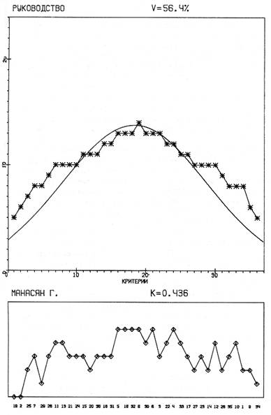 Ось абсцисс на графиках отражает независимую переменную - номера качеств (критерии), а ось ординат - соответственно количество набранных голосов по каждому критерию. На приведенных графиках в виде гладкой линии представлен интегральный образ рассматриваемого коллектива, в виде ломанной со звездочками - образ руководства данного коллектива. Кривая с прямоугольными маркерами характеризует распределение голосов одного из членов руководства. Если перечень качеств сформирован правильно, т.е. адекватен требованиям задач, для которых сформирован коллектив, то полученный коллективный портрет-график распределения голосов характеризуется формой, близкой к кривой нормального распределения.